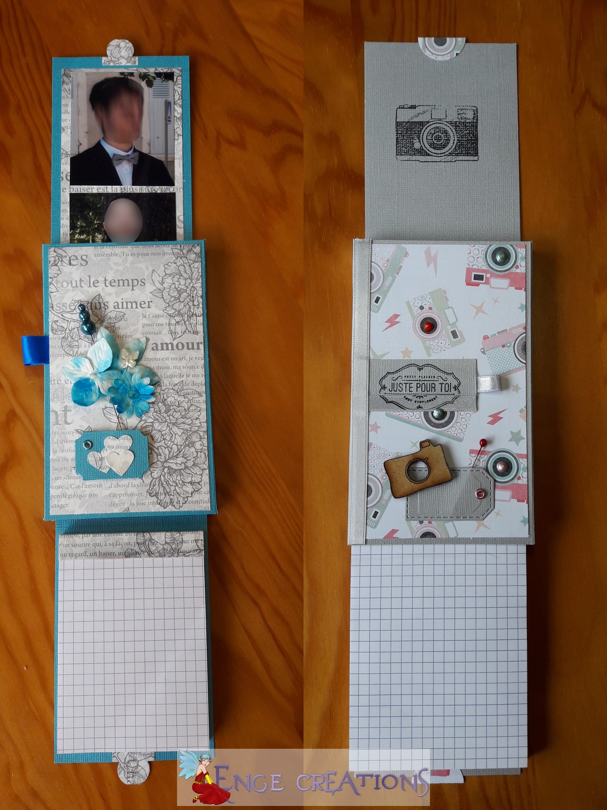 Une jolie après-midi, très sympathique. De belles réalisations, pas trop difficiles, juste ce qu’il faut pour ne pas s’ennuyer, et un fini bluffant avec cette page coulissante qui révèle une photo en parallèle avec le bloc-notes.