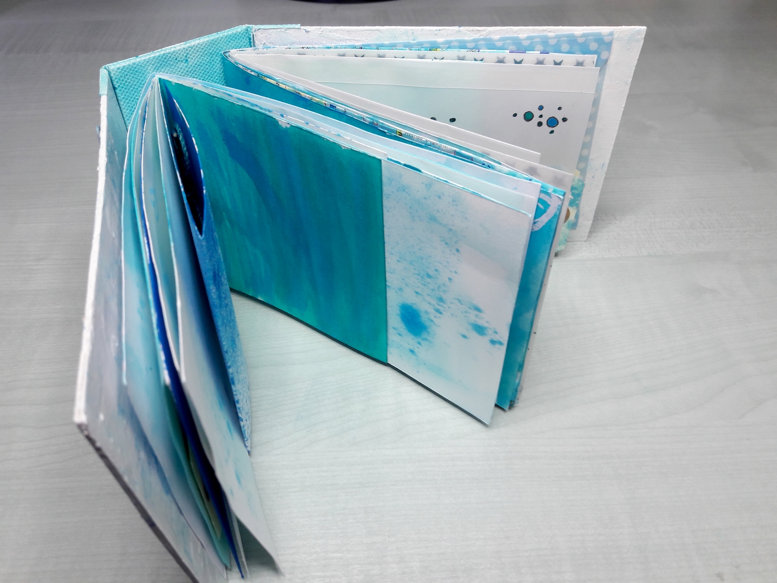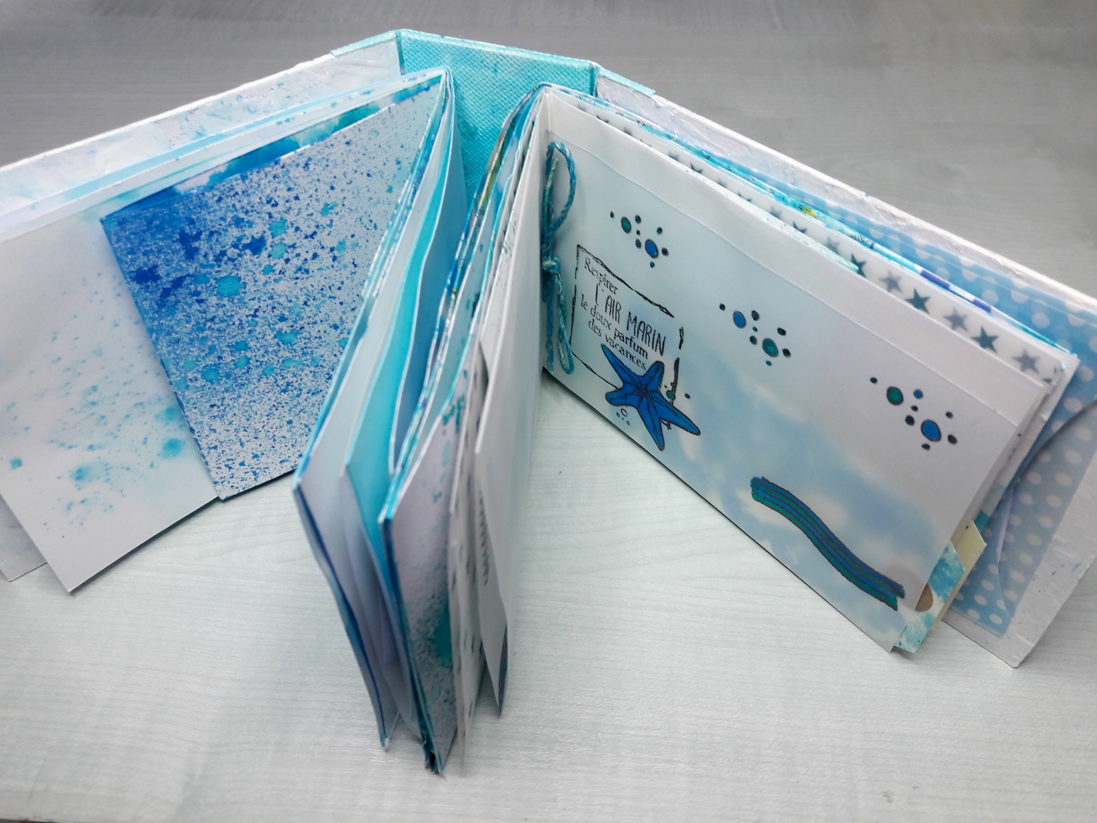 Techniquement, je suis plutôt contente de ce que j’ai fait. J’ai même réussi à me débrouiller avec les tamponnages à la Stazon. J’aime un peu moins le résultat final que le mini répertoire de la Box Teknics Distress Ink, mais c’est juste une question de gout. Ou peut-être aussi que comme je n’ai pas pu fignoler aussi bien ma réalisation qu’il ne l’aurait fallu (ou que je l’aurai voulu), cela me plait un peu moins au rendu : pas de quoi percer convenablement des oeillets par exemple, ou pas de Gesso.