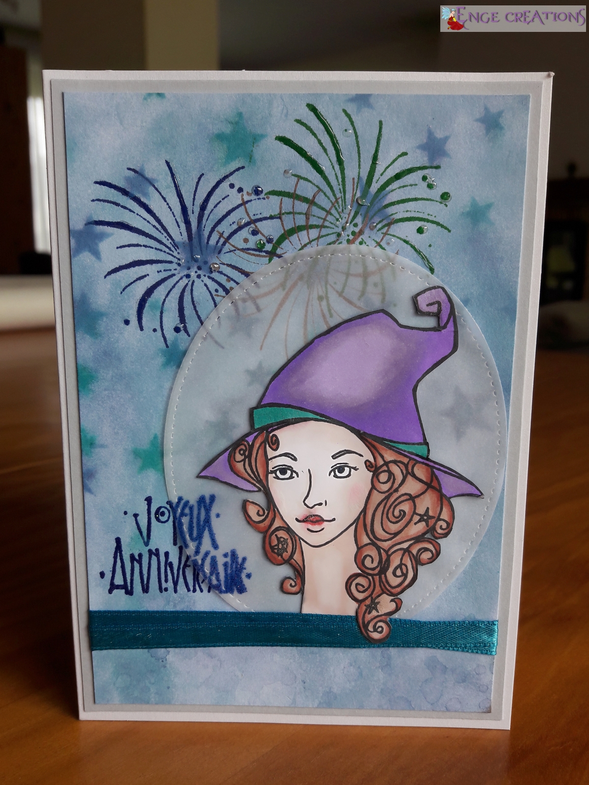 Je garderai l’idée du ruban pour éviter que la magicienne ai la tête tranchée. Peut-être pas agencé comme je l’ai fait. Ce qui m’a bloqué pour ce ruban, c’est que j’aurai aimé un joli noeud pour le finir, mais qu’alors je n’arrivais pas placer mon tampon « Joyeux anniversaire ».