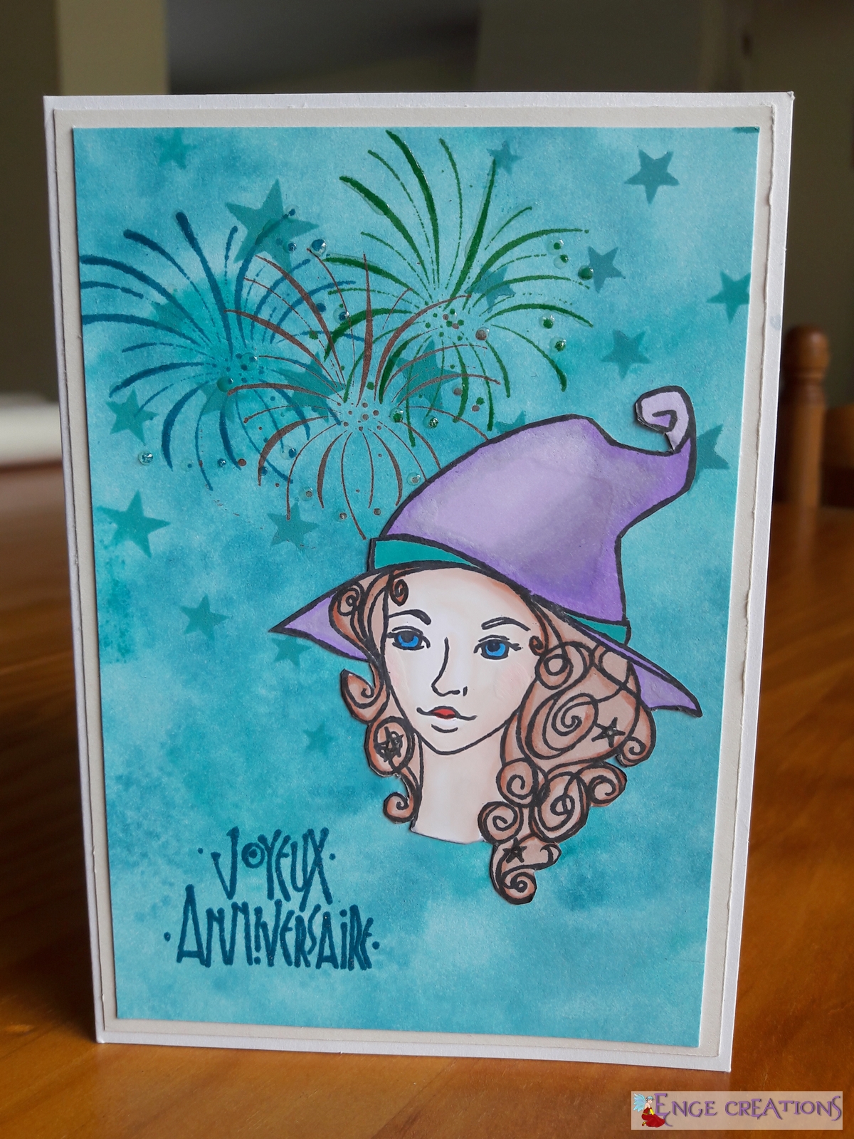 C’est une carte d’anniversaire, avec des feux d’artifice et une magicienne. Alors autant se lâcher sur le brillant et les paillettes ! J’ai mis des touches de Glossy accent sur les feux d’artifice (les trainées de feu et les boules), et des touches de paillettes au pinceau Spectrum noir sur la magicienne (les joues, le haut du chapeau, et – hélas – la bouche).