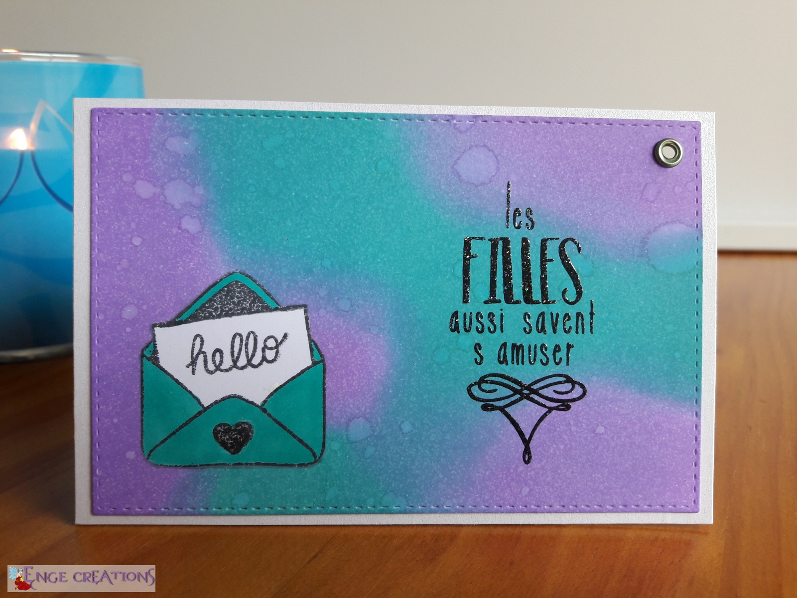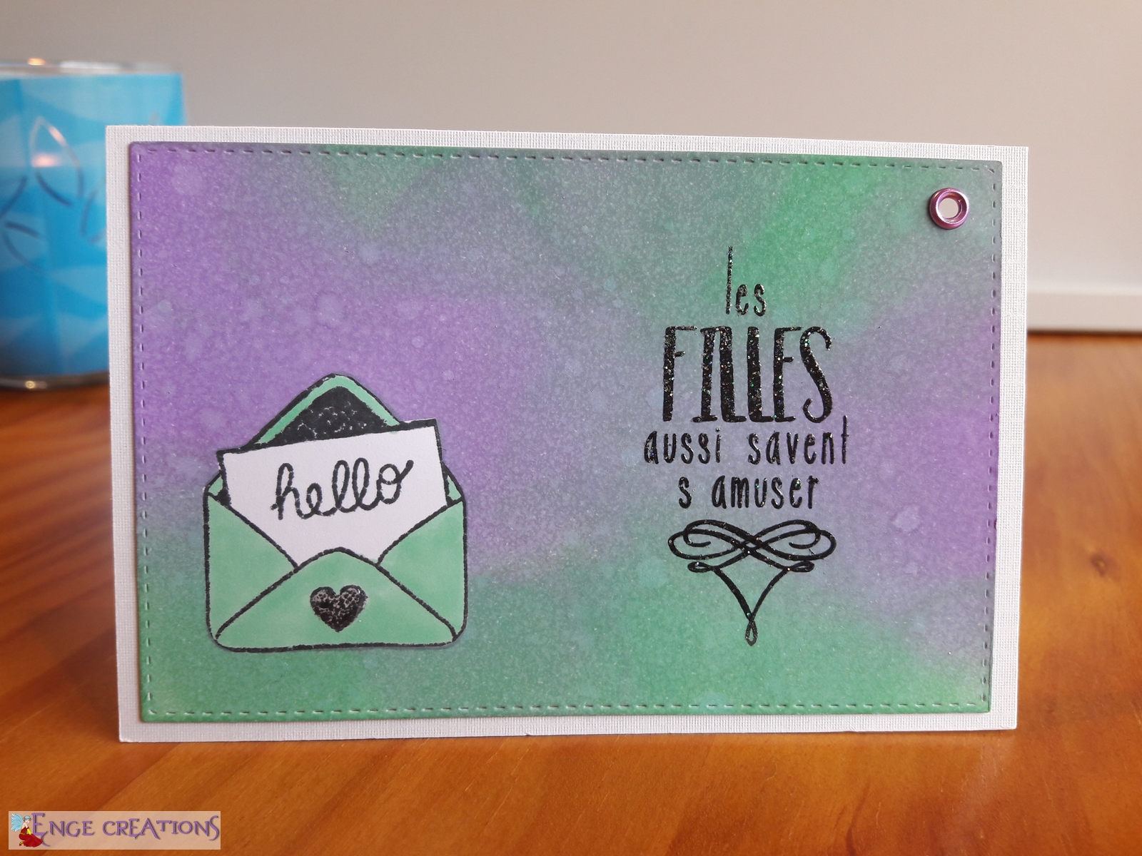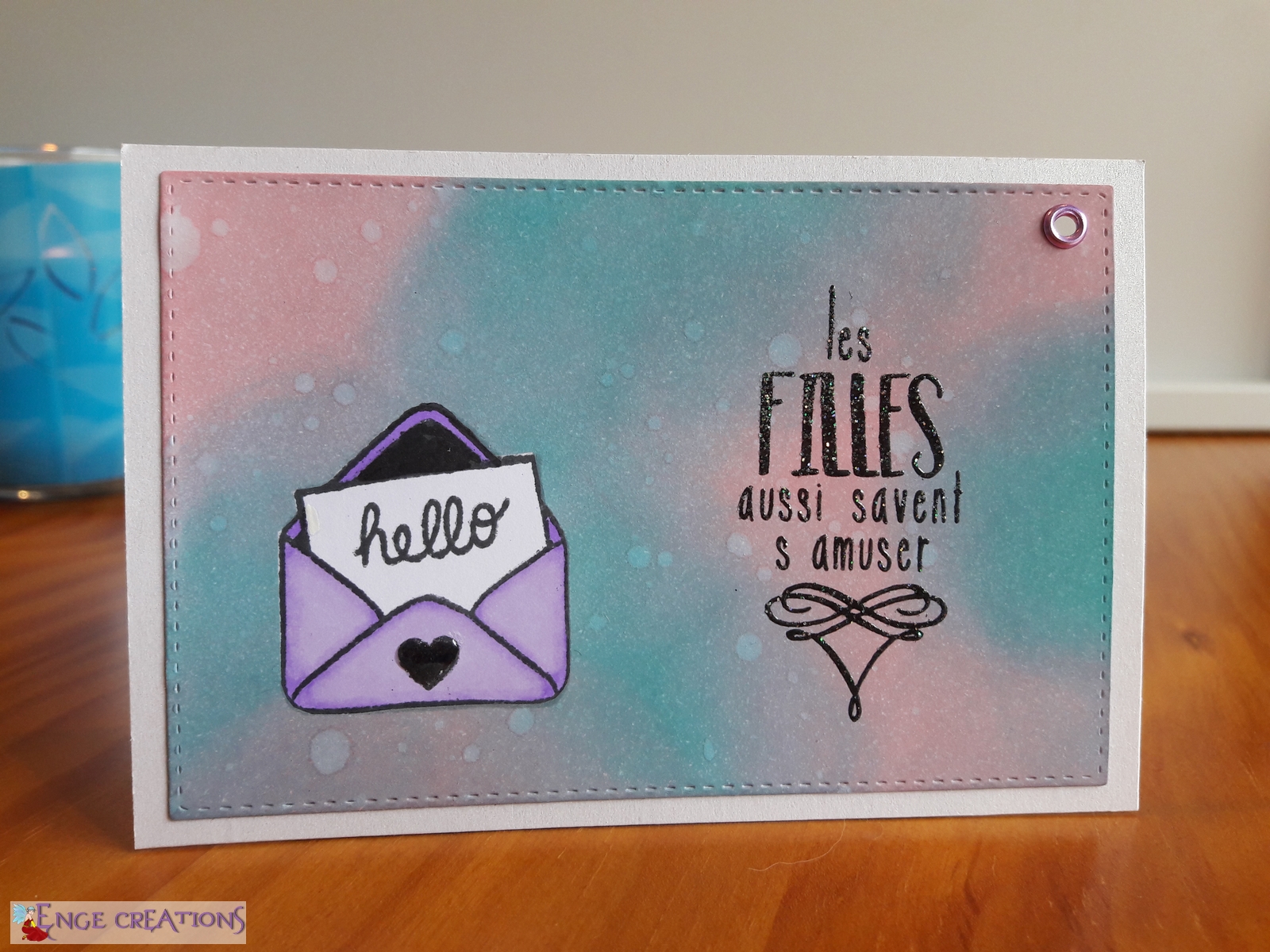 Le message a été tamponné à la Versafine noire, puis embossé avec de la poudre pailletée transparente Izinc. C’est décidément un combo que j’adore : Versafine + poudre transparente. Cela permet d’avoir toutes les couleurs d’embossage sans se ruiner et la Versafine a un fini très fin, que ne dénature pas cette poudre pailletée.