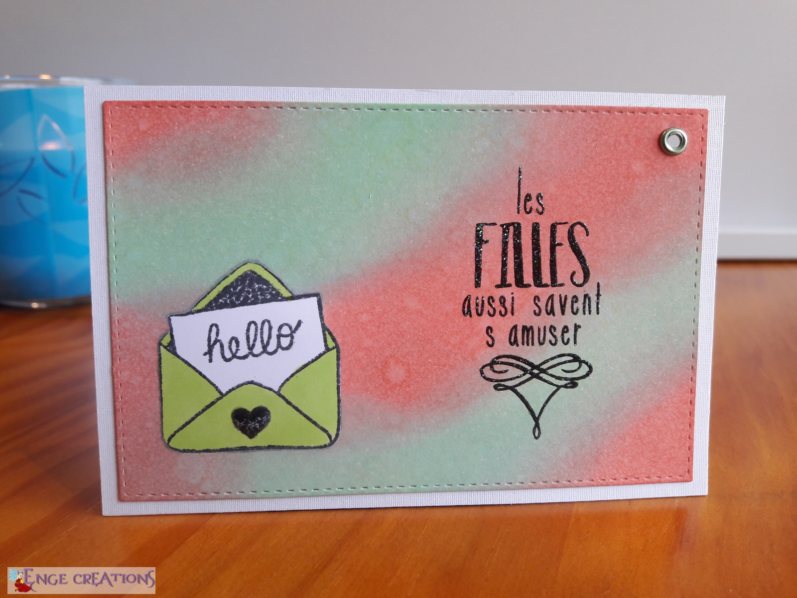 Pour coller au thème de la carte (un courrier pour envoyer des entrées pour Version Scrap Paris 2018), et après avoir écarté un très joli tampon Boite aux lettres vintage de Carabelle Studio, car trop de détails à découper, Mini-Enge et moi avons porté notre choix sur un tampon enveloppe très simple mais efficace de chez Artemio et le message percutant et très approprié « Les filles aussi savent s’amuser » du set « Nos folles années », création exclusive de Manuela Jamet pour Ithylia Créations.