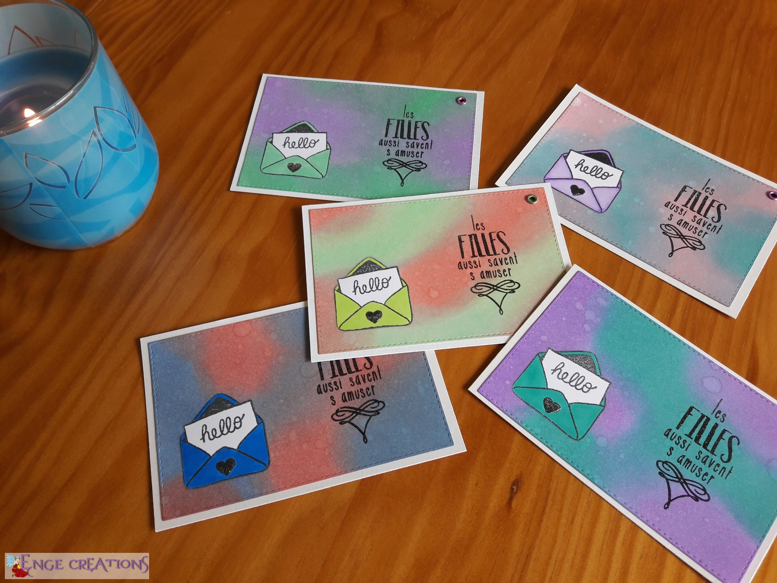 Pas facile de sortir de sa zone de confort, mais on est toujours d’autant plus satisfait de soi quand ça fonctionne. Je ne vais pas dire que j’adore tous les rendus, mais il n’y en a aucun que je n’aime pas. La douceur du rose et bleu turquoise de la première carte me parle beaucoup, c’est probablement ma préférée, alors que le combo rose / bleu n’est pas mon choix de prédilection. Même celles avec le orange, qui est une couleur que je n’aime pas beaucoup, ont leur charme.